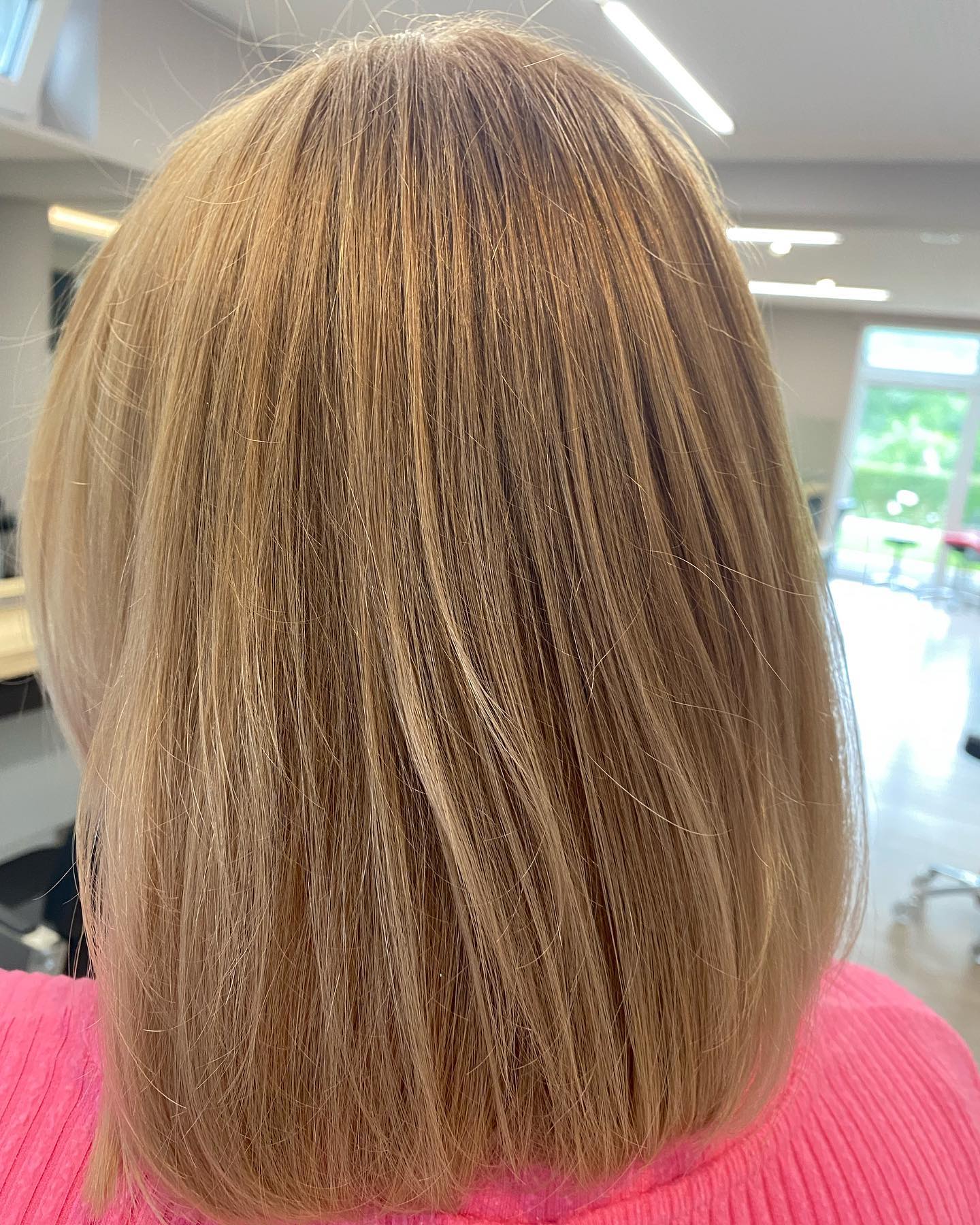 „Ein Rücken kann auch entzücken…“ brillante Haarfarbe in einem warmen #honigblond mit einem soften Haarschnitt in #halblang